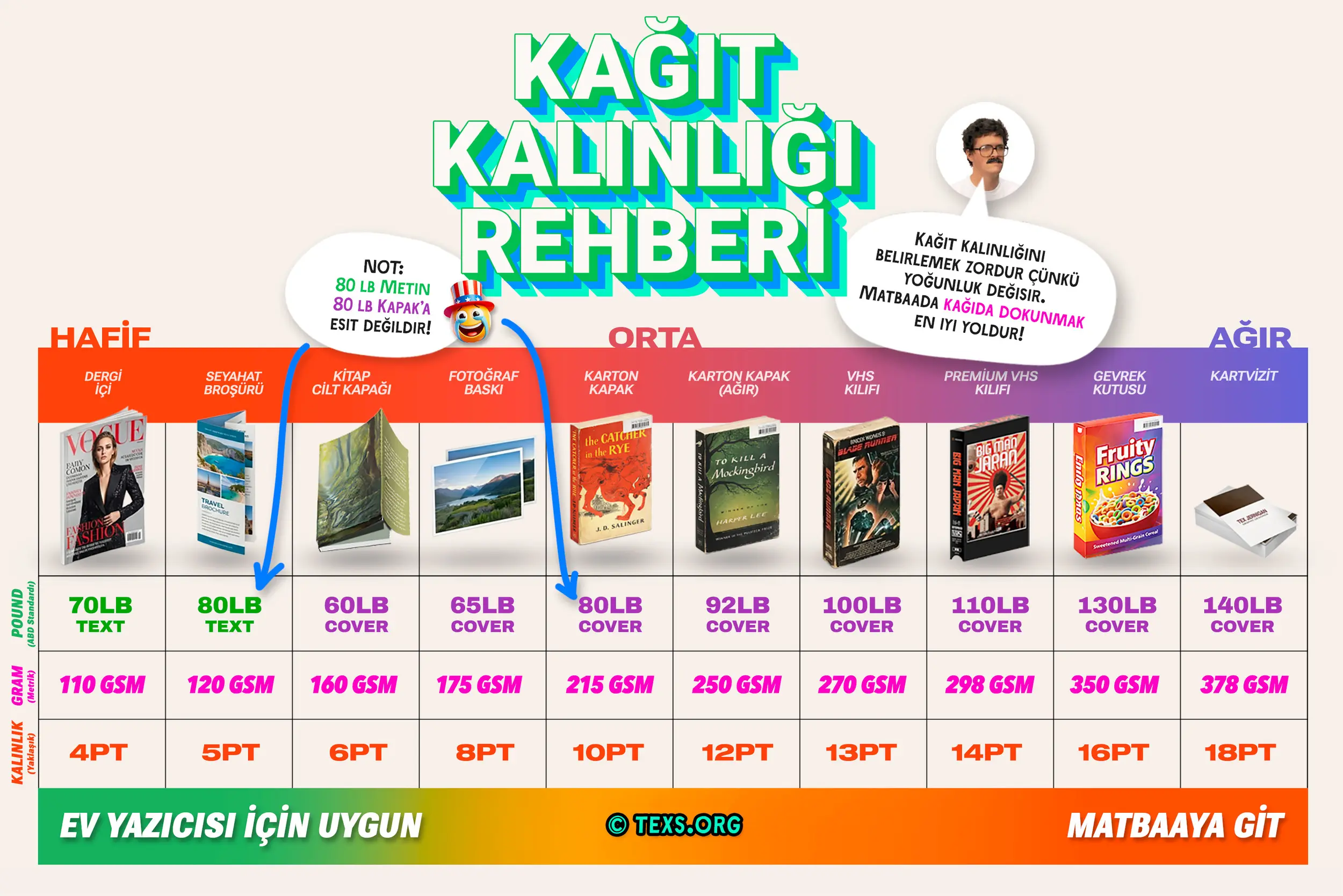 Profesyonel görünümlü sonuçlar için doğru kağıdı seçmek çok önemlidir. Kağıt ağırlığı GSM (metrekare başına gram) ile ölçülür — yüksek sayılar daha kalın, daha sağlam kağıt anlamına gelir. Etiketler için çıkartma kağıdı kullanın. Katlanması gereken kılıflar ve kapaklar için 200-250 GSM karton hedefleyin. Daha hafif kağıt (160 GSM) daha kolay katlanır ancak daha ince hissettirir, daha ağır kağıt (250+ GSM) ise daha dayanıklıdır ancak katlandığında kırılabilir.